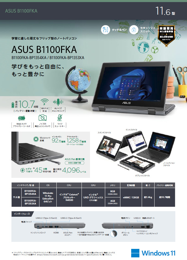 (Celeron N4500/4GB/eMMC・128GB/ODD無/Windows 11 Pro Education)
